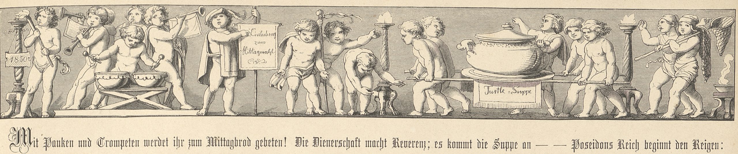Und auch künstlerisch wurde das Thema Speisen in unserer Familie immer wieder bearbeitet, sei es in Stilleben von Heinrich Hübner oder durch Julius Hübner, von dem u.a. der Entwurf eines meterlangen Frieses einer „Speisekarte“ im Germanischen Nationalmuseum in Nürnberg überliefert ist. Im “Deutschen Bilderbogen für jung und alt” N°186 des Gustav Weise Verlages Stuttgart wurde dies Speisekarte 1870 publiziert.