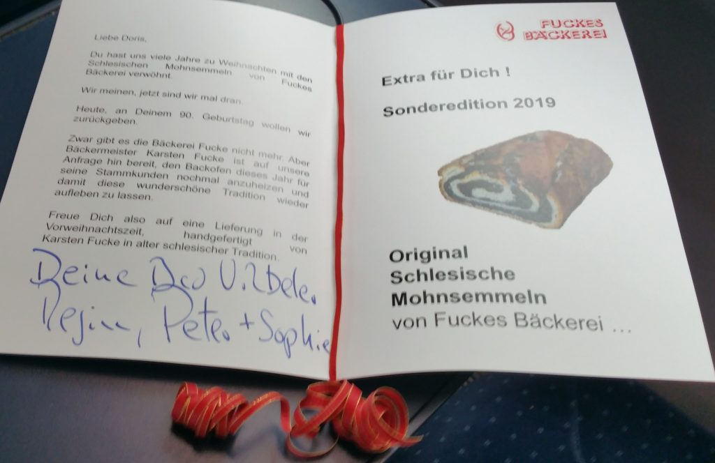 So gab es im Jahr 2019 eine vorläufig letzte Sonderanfertigung für uns alle, „The Last Edition – Schlesischer Mohnsemmel„. Diese Köstlichkeit habe ich auch an meine Geschwister von Hamburg bis München verschicken lassen. Kindheitserinnerungen eben!